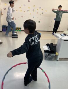 サーキットトレーニングでは最近フラフープが人気で、皆コツを掴もうと頑張っています!