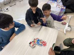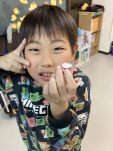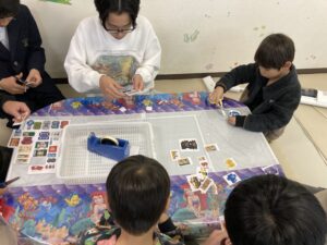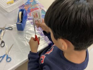 どの線で切り、どの線で折るかなどを想像するのが難しい子、想像できても細かな作業が苦手な子は苦労していましたが、得意な子はとても丁寧に仕上げ、きれいな箱ができていました。自分の箱が立体になっていないことに、自分で笑ってしまっている子もいました。