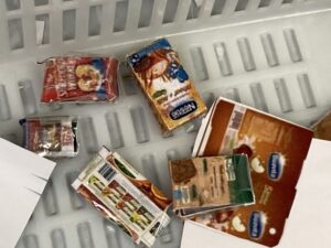 箱作りではミニチュアの商品パッケージの展開図を切り取り、箱を組み立てました。