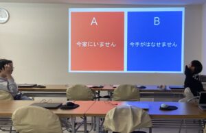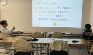 2025/12/23 ダンスの基礎と電話対応(家庭編)です。 前回は電話対応(会社編)を行いましたが、今日は家庭で電話がかかってきたときの対応を練習しました。それぞれが携帯電話を持つ時代なので、家に電話がない家庭も多く、取り次ぐことも少なくなりましたが、取り次ぐ際の注意点や、家に一人で居るときにかかってきた際の電話対応について学習しました。 「昔はダイヤル式やろ?」とドラえもんに出てくるそうで、古い電話のことを皆よく知っていました笑