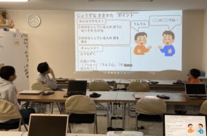 2026/01/27 「聞き方のコツ」と豆つかみです。 聞き方のコツでは、「傾聴」という言葉があるように、人の話を聞く際は、目を見て体を向け、頷き相づちを打つなど、相手に共感することが大切である事を学習しました。 コツを学んだ後は、二人一組で話し手・聞き手に分かれて、上手に傾聴できているかを互いにチェックしてもらいました。 プログラム中、スタッフが説明をしているときに、手遊びなどをして全く話を聞いていない子に「先生が今何と言ったか言ってごらん!!」と当てると、そんな子に限ってちゃんと聞いていて言えるんですよね、これがまた・・・ そして、目を見て体を向けて頷いている子は、全く分かっていなかったりするのです・・・・とほほ そんな子こんな子の外見(態度)と中身(理解度)のすりあわせをしていくのがはばたくです笑