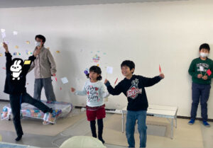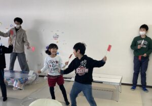 「旗揚げ」は初めての子も居て、赤・白の他に「あげる、さげる、あげない、さげない」など情報が多く混乱していましたが、「足上げて」などのイレギュラーも入り、踊りながら楽しく参加できました。