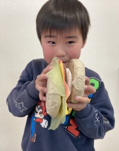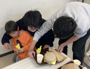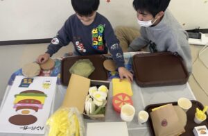 「フードサービス業」ではホールとキッチンの業務内容を知り、調理や提供、接客などの他、安全管理や衛生管理などにも気を配らないといけないことを知り、ハンバーガー屋さんで実践しました。