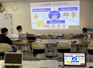 睡眠教育では、しっかり寝ると体を成長させたり、記憶を定着させたり、疲れが取れたりなど、体も心も元気になるということを学び、自分に必要な睡眠時間などを知りました。