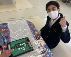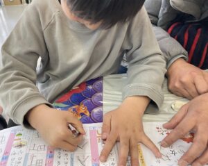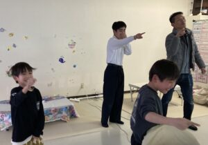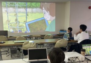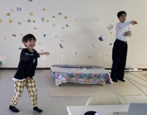 2026/03/12 端末を用いた家庭学習とインタラクティブです。 インタラクティブは、映像に合わせた動きをすることにより、映像の展開に影響を与えているような錯覚に陥る没入型のプログラムで、今日で2回目です。マリオになりきりジャンプしてコインを取るなど、色んなバージョンがあり、今日も笑いながら楽しんでいました!