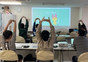 「心と体の元気」では、心と体は常に影響し合っているため、よく食べよく寝て運動することが大切であることを学び、セルフタッチやリラックス呼吸法、力を抜く練習などをしました。