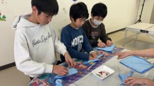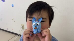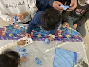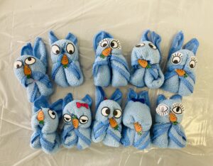 2026/03/30 タオルマスコットです。 小さなおしぼりを使って、巻いたり折ったり輪ゴムで留めたりしながら動物を作りました。去年は「くま」を作りましたが、今年は「うさぎ」です。 製作過程は単純なのですが、丸みを帯びた顔にしたり、耳の長さを揃えたり等の微調整が難しかったようです。 最後に好きなシールを貼ってとても可愛い??オリジナルのうさぎが完成しました!