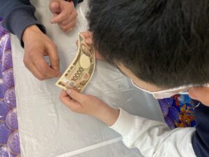 2026/04/22 資料作りと金融と経済です。 「金融と経済」と聞くと、とんでもなく難しく聞こえますが、とっても簡単な子ども向けのお金のお話です。 今日は、シリーズ第2弾で「1万円札を作るのに約20円かかる」ということがわかりました。 また、お金は信用で成り立っているため、偽造防止策として、表面がざらざらしていたり、肉眼で分からないほど小さな文字が書かれていたり、光るインクが使われていたり、見る角度によって人の顔が回転したり、文字が浮かび上がったりなど、様々な工夫がされていることを知り、子どもたちは「へー」という感想でした笑
