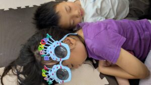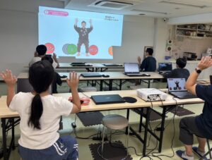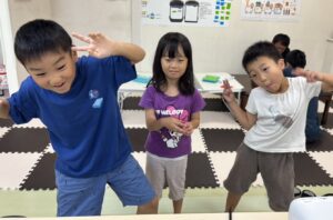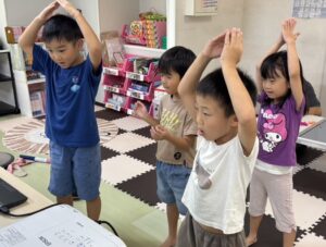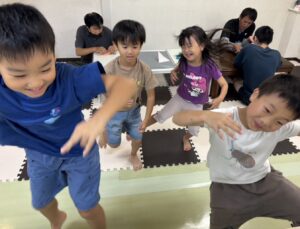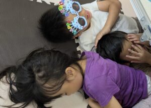 2025/10/02 個人懇談とリズム体操です。 最近、小さいお友達がとても増えており、騒いだり走り回ったりすると大きな子たちが落ち着かないということで、今日は「静かにじっとする練習」をしました。「10分だけ、体を落ち着かせよう」と横になると、ガチ寝する子も居ました! 少しずつ、落ち着いて静かに過ごす練習をしていきましょう笑