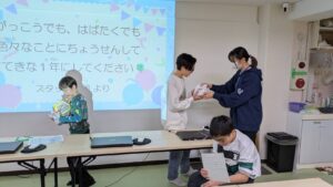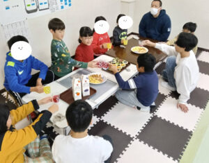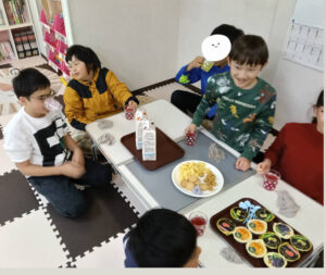 両教室お誕生日の子が来てくれたので、皆で歌を歌い、乾杯してお祝いしました。