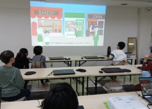 自分がパン屋さんだとしたら、お客さんを増やすためにどのような工夫をするかを聞くと「ポスターを貼る」「新商品を作る」「見た目にこだわる」などの意見が出ました。