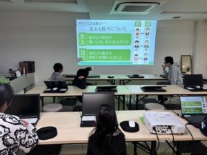 敬語の種類や使い方について学習し、最後にクイズで復習をしました。何でもかんでも「お」や「ご」をつけると丁寧語になるわけではありません笑