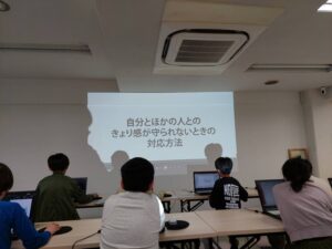 2026/04/21 「距離感を考えよう」とパワーポイントでの自己紹介作成です。 自分とほかの人との距離感が守られない時の対応方法を考えました。 心の距離と体の距離がある事を知り、自分の気持ちや考え方は自分で決めて良いということに加え、人それぞれ心の距離感と体の距離感は違うということを学習しました。 自分が誘って断られたときに、相手の気持ちを理解することや、はっきり断れない子の代わりに「いやなんじゃないかな」と言ってあげることも大切です。 自分が距離感を守られず嫌な思いをしたときは、嫌だと言ってその場を離れたり、大人に相談するなどの対処をして下さいね。